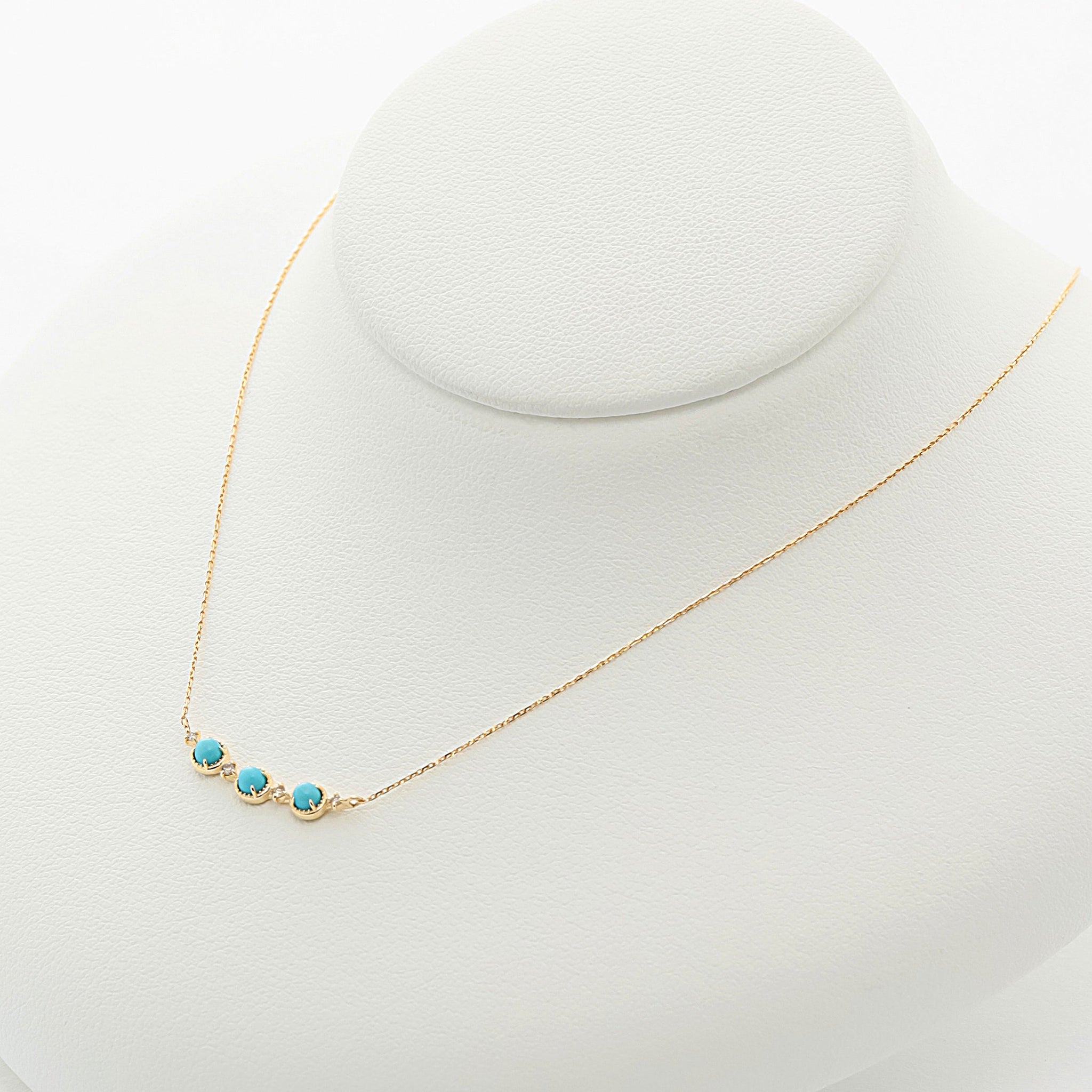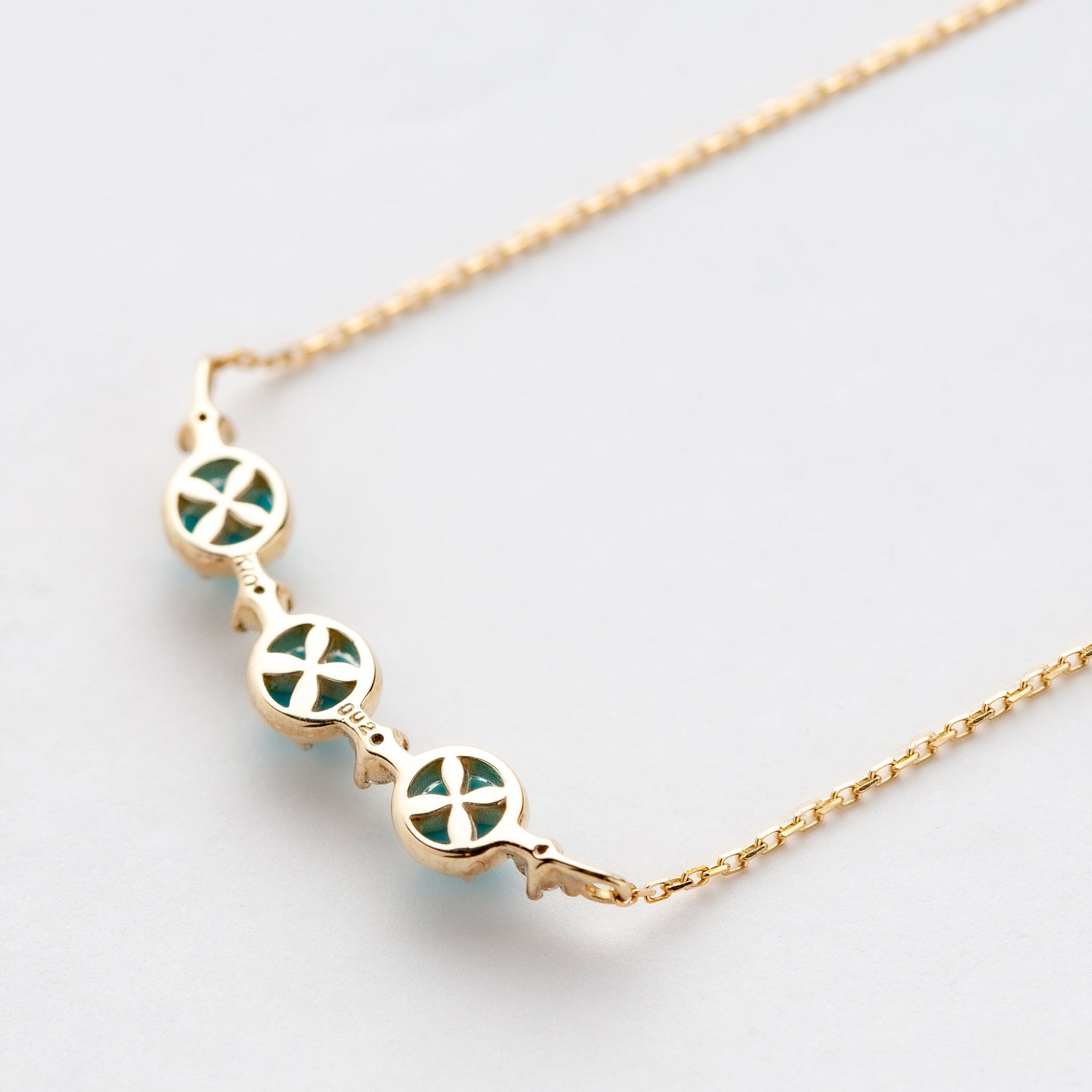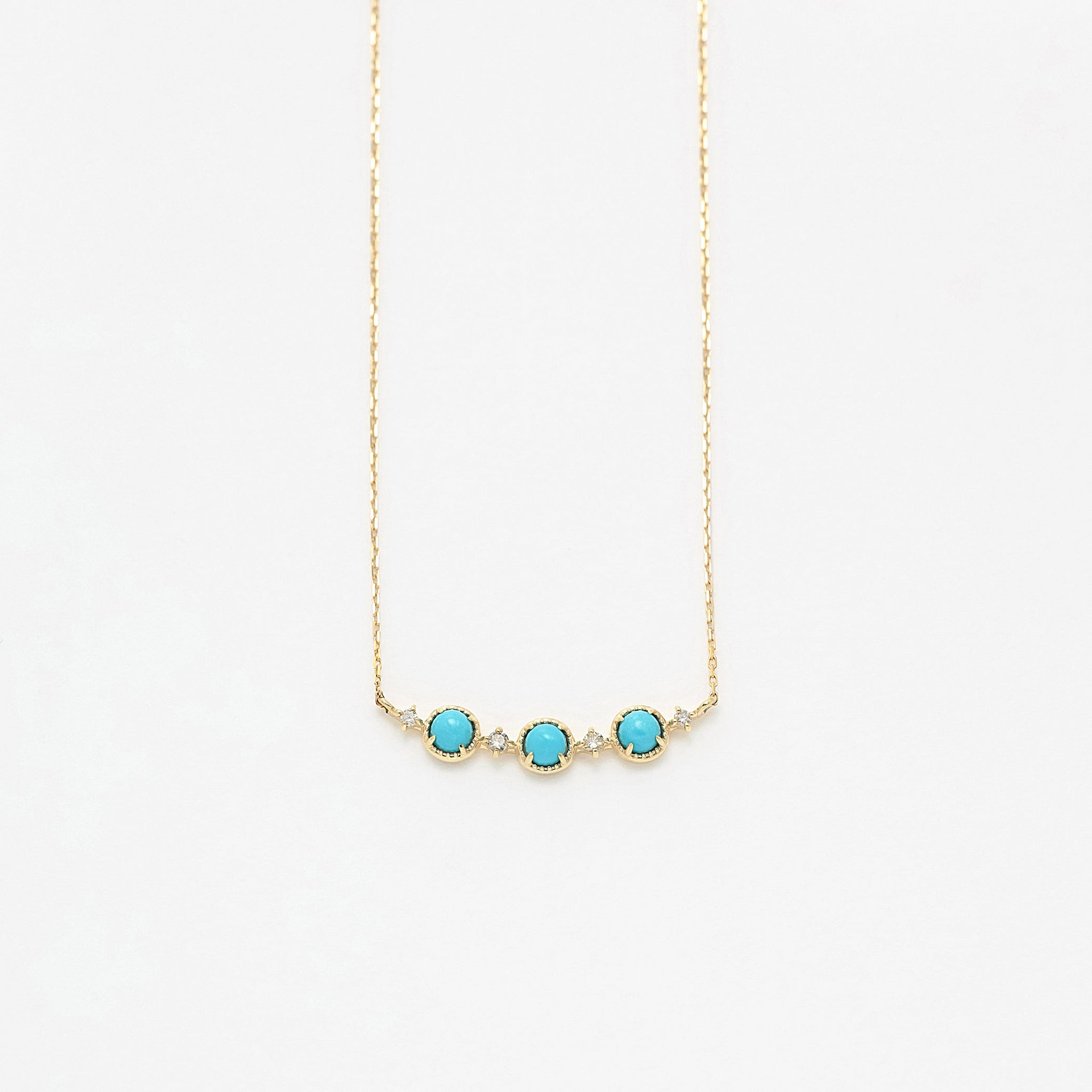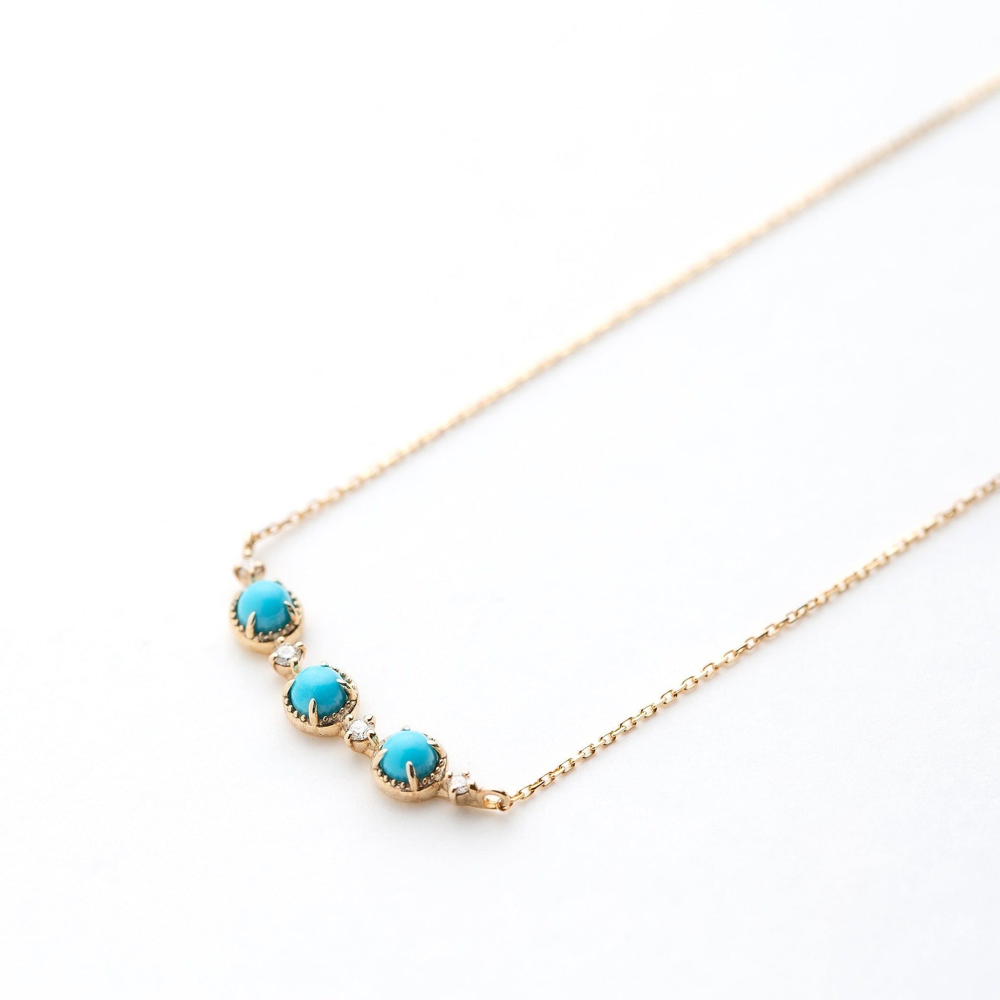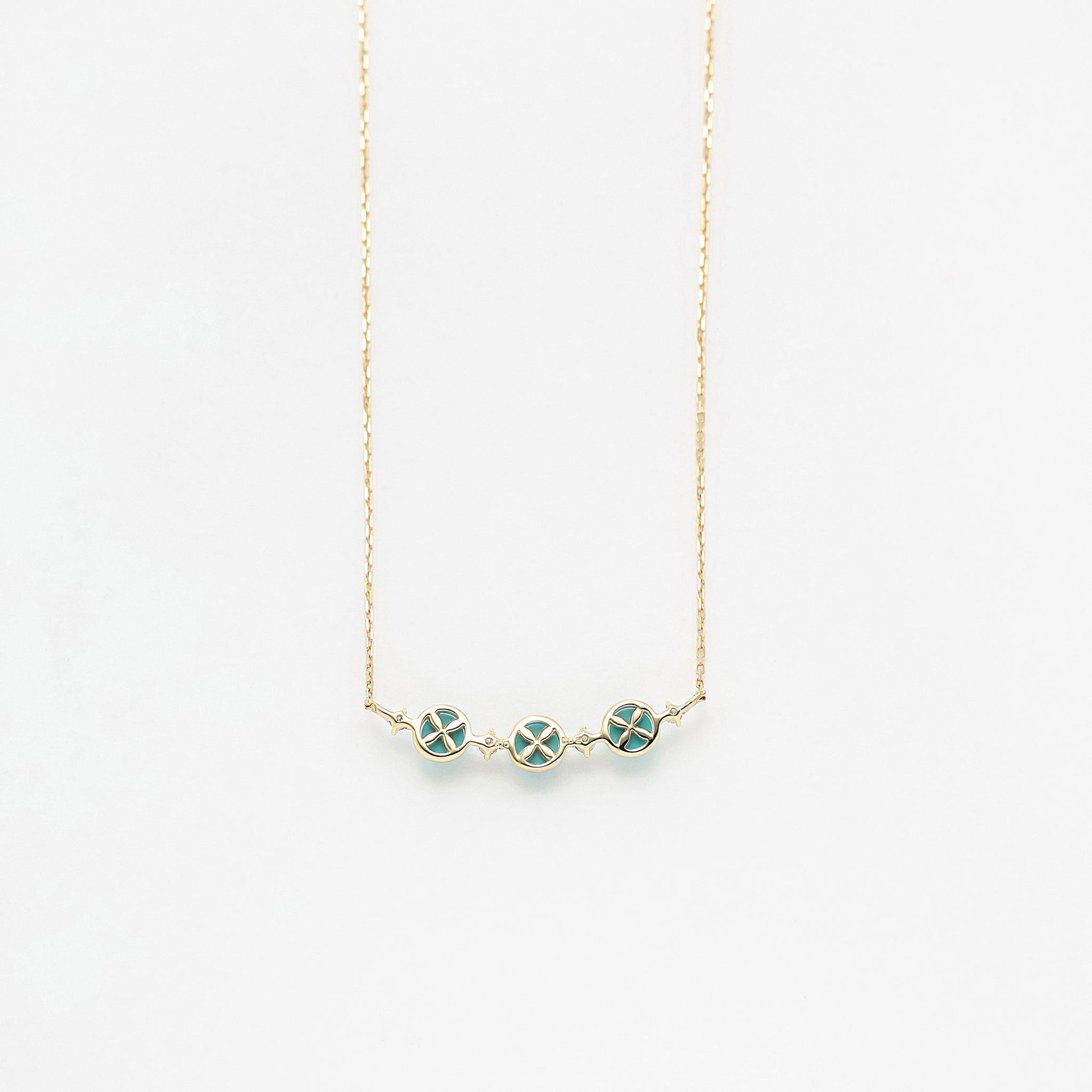 澄んだ空や海を思わせるターコイズが、デコルテを美しく彩るイエローゴールドのネックレス。