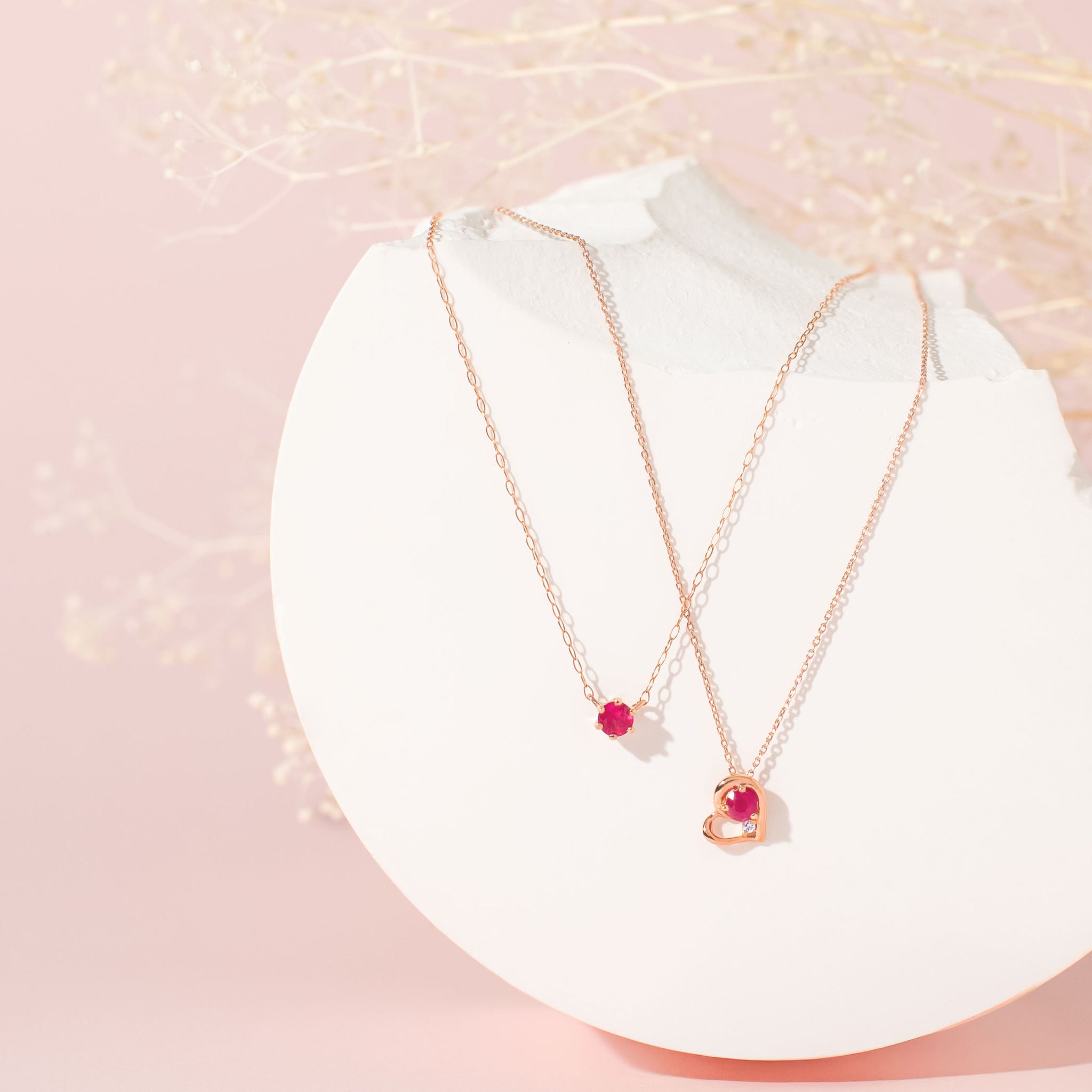 ハートの中にルビーとダイヤモンドをあしらった、愛らしいネックレスです。ピンク色のルビーが、女性らしさをさらにプラスしてくれます。