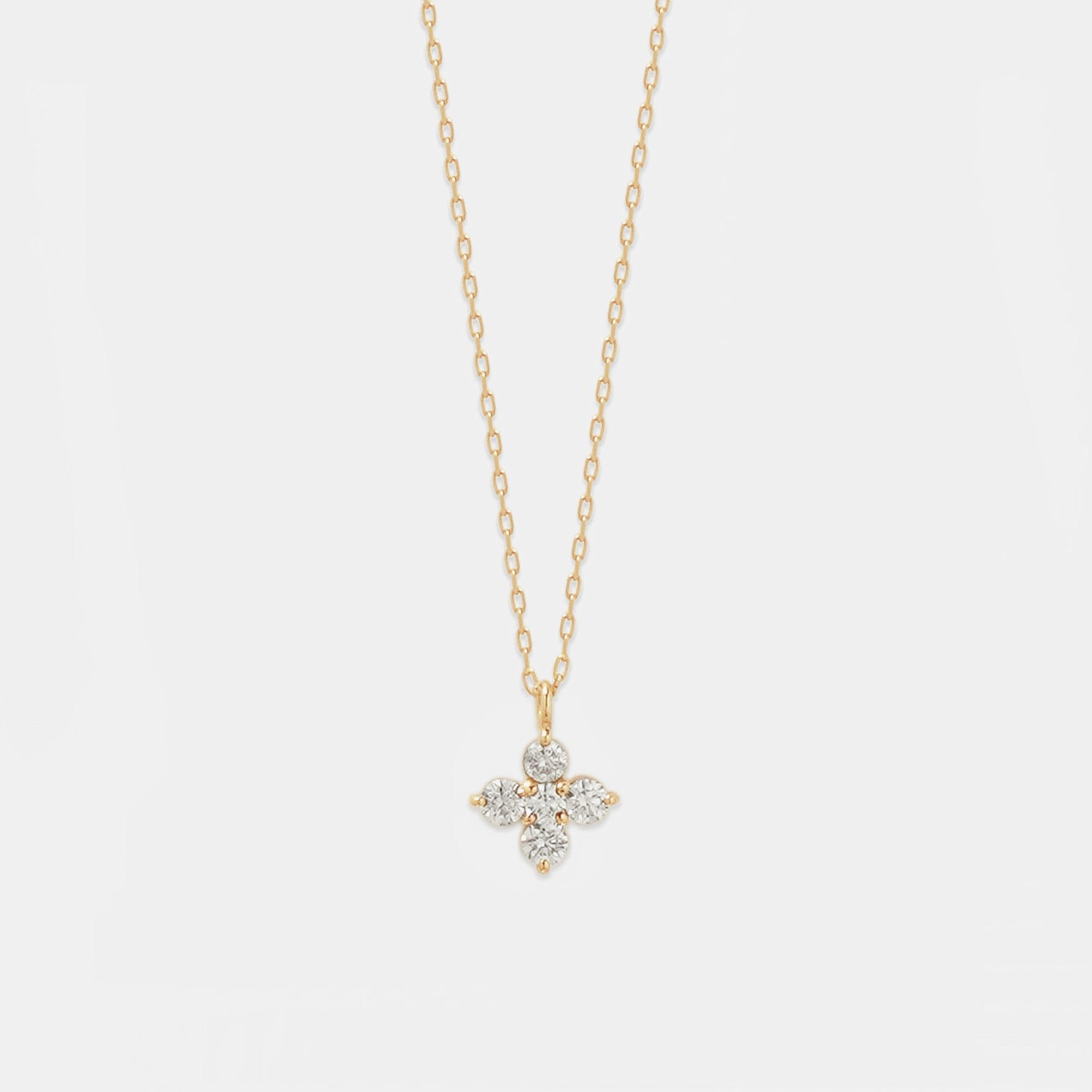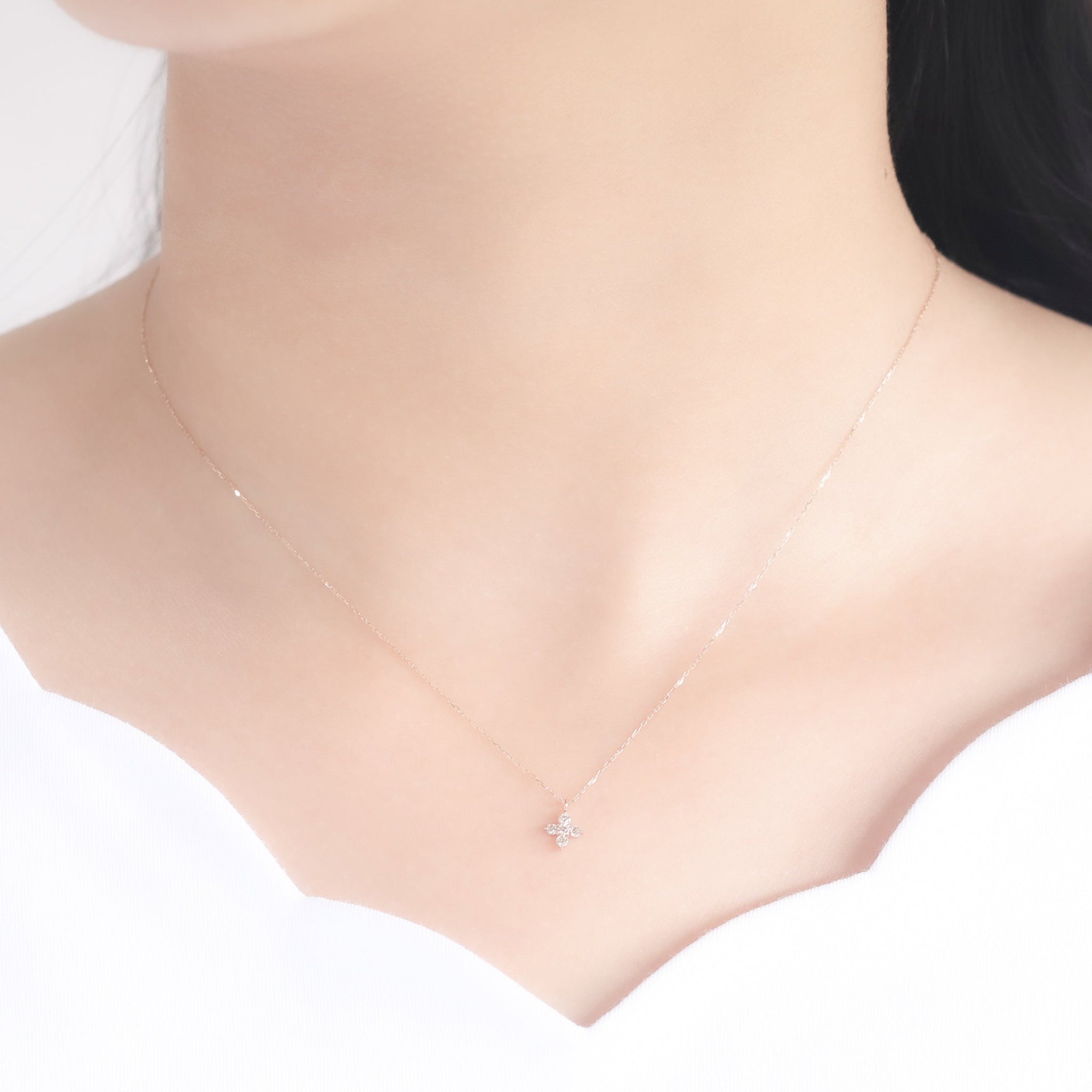 ダイヤモンドを花のように並べたデザインが、胸元に上品な輝きを添えます。