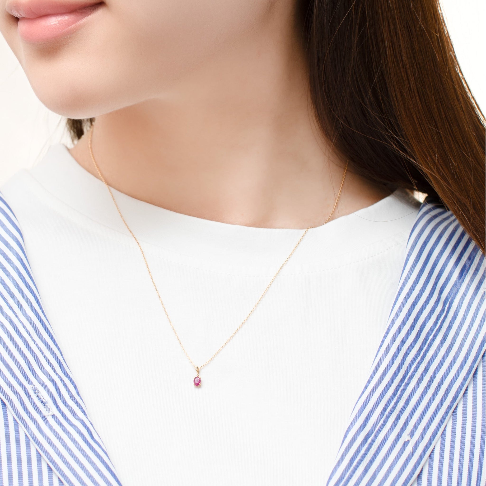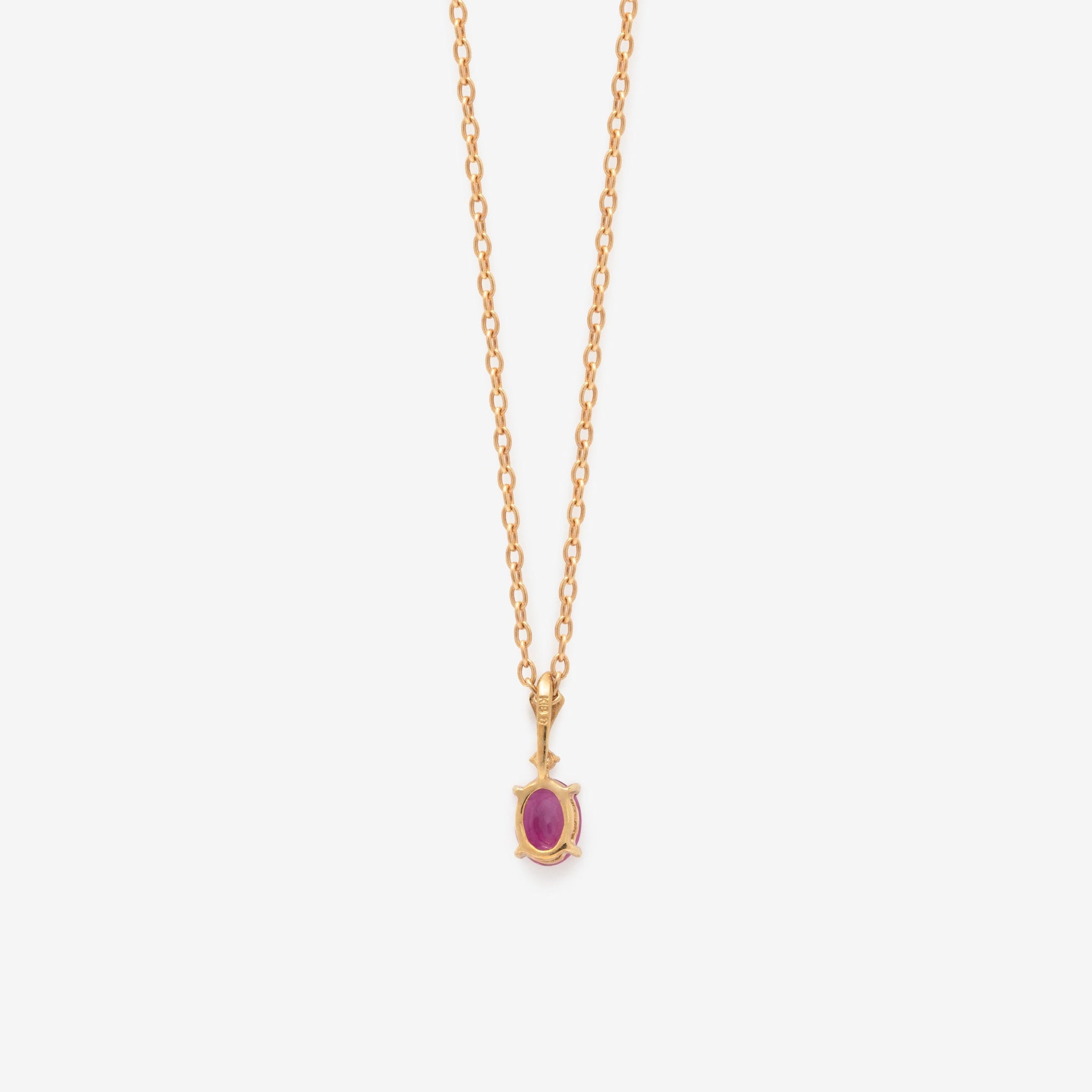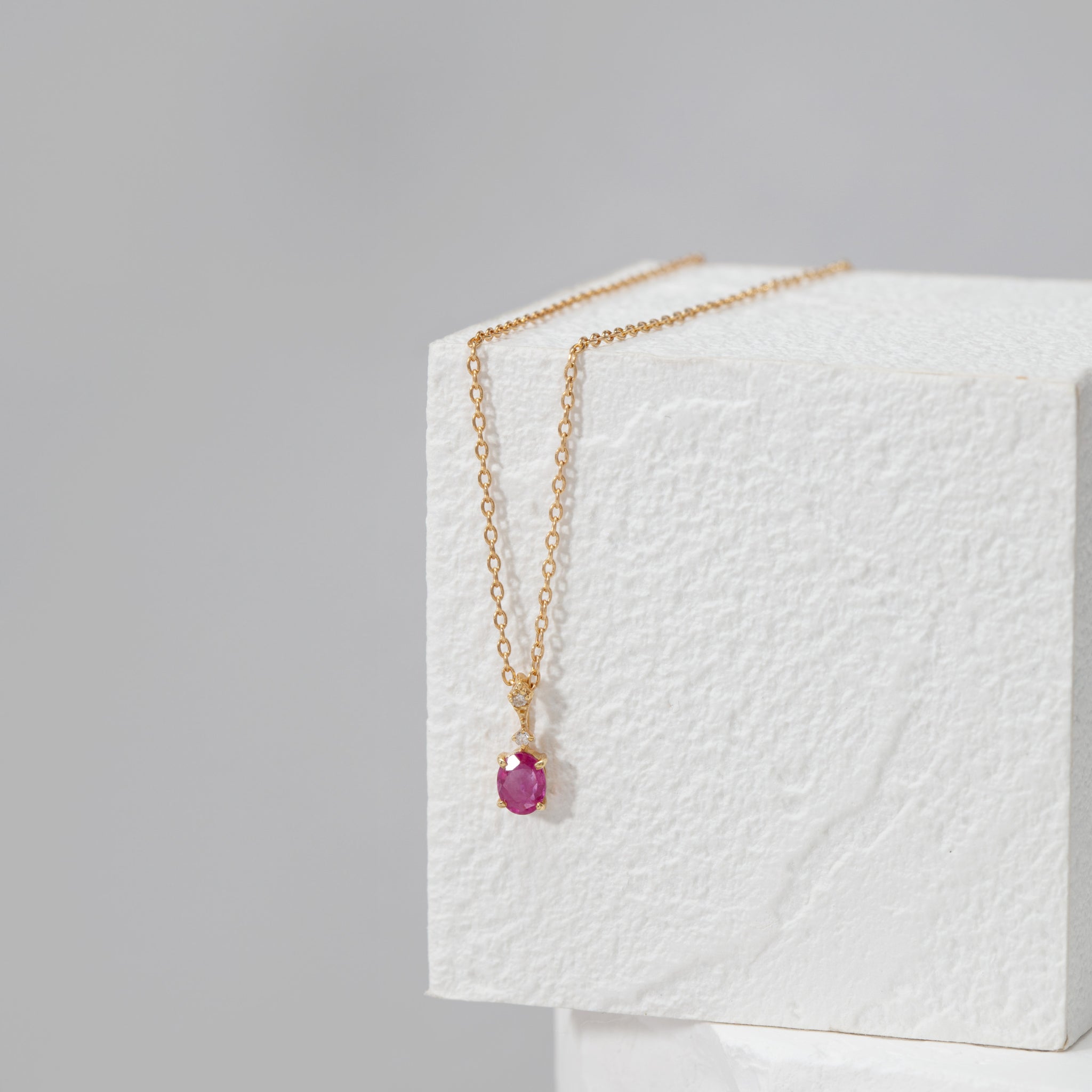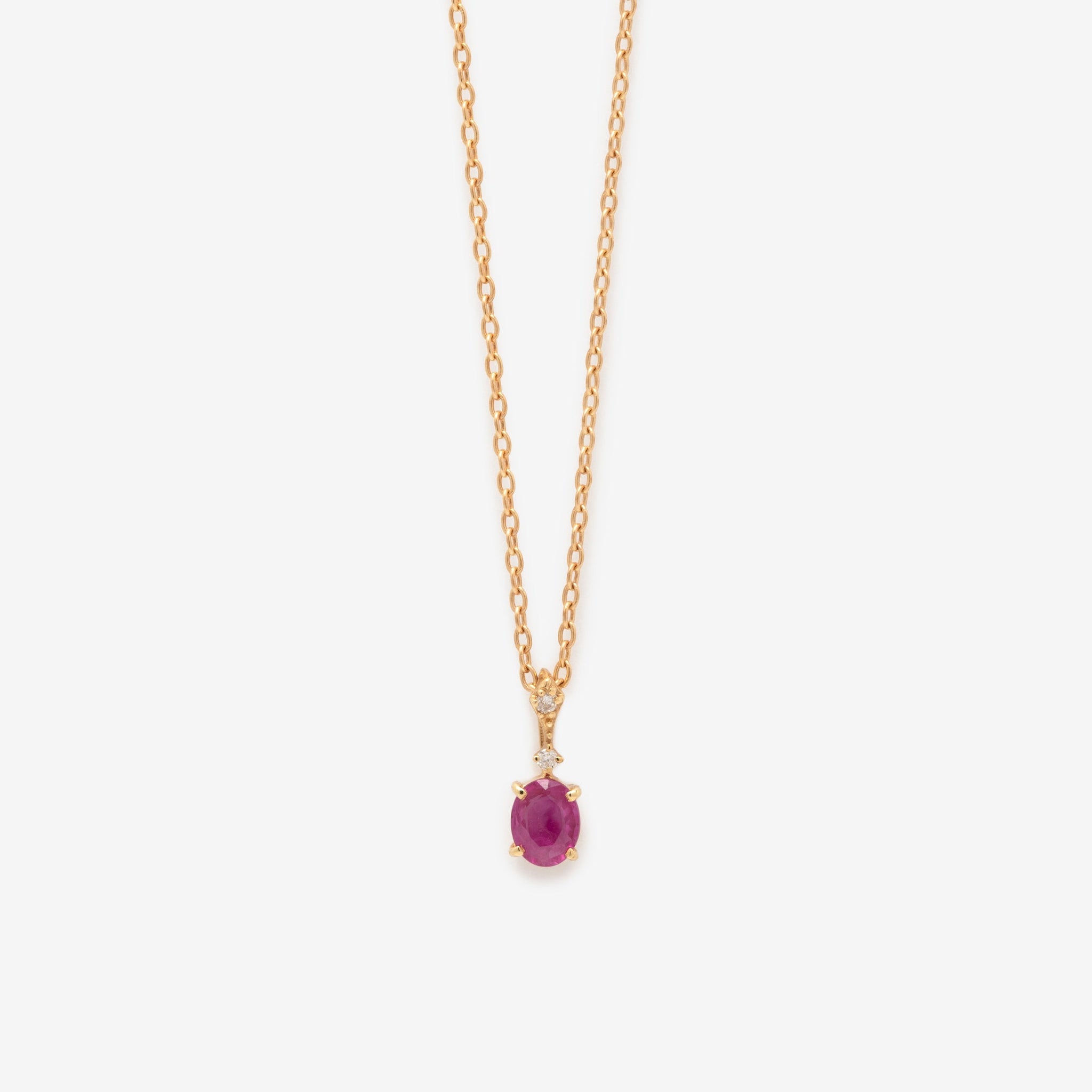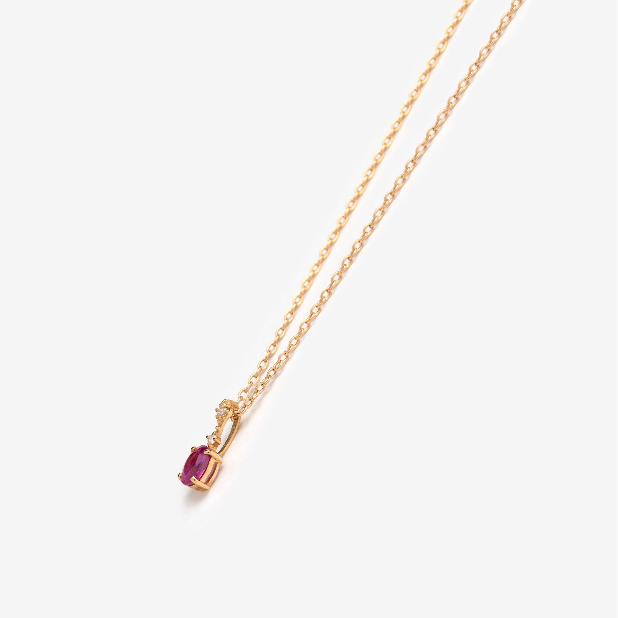 深みのあるルビーの色合いが際立つ、イエローゴールドのネックレス。
