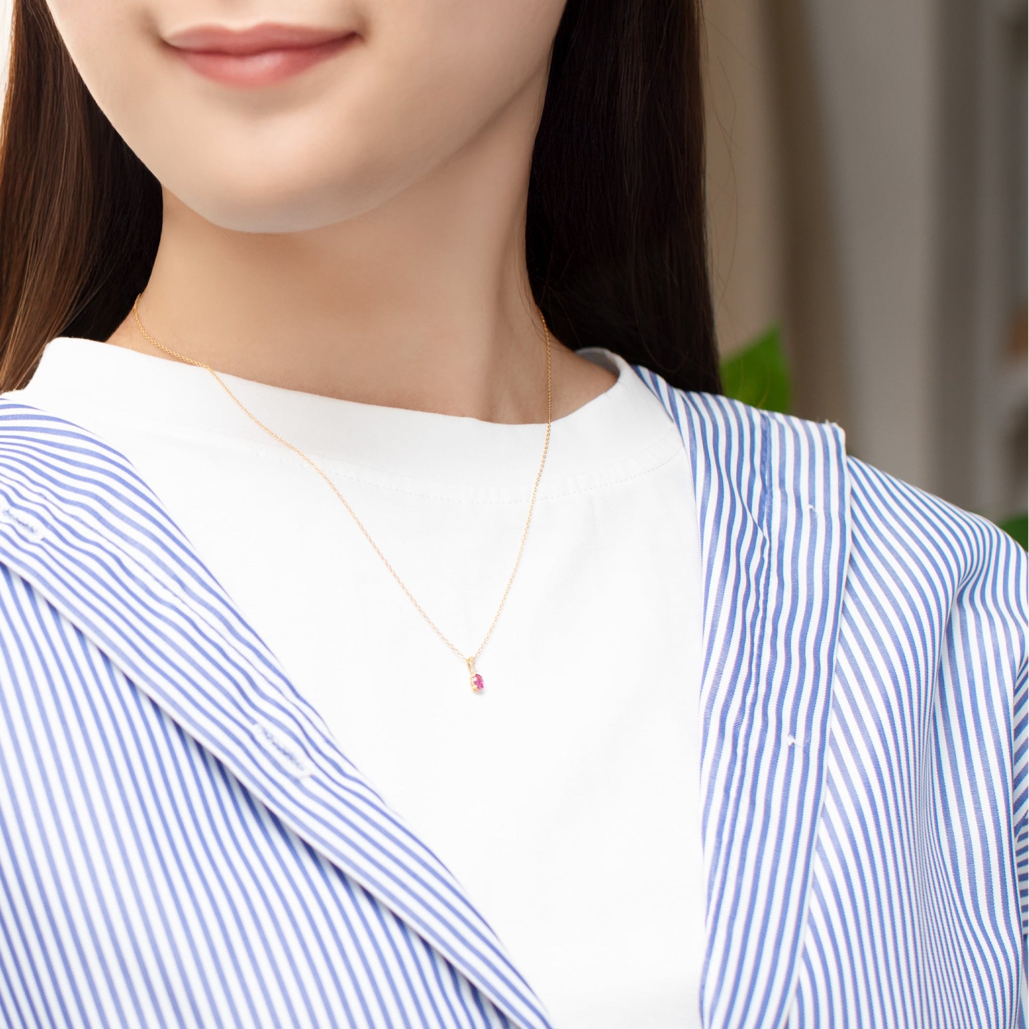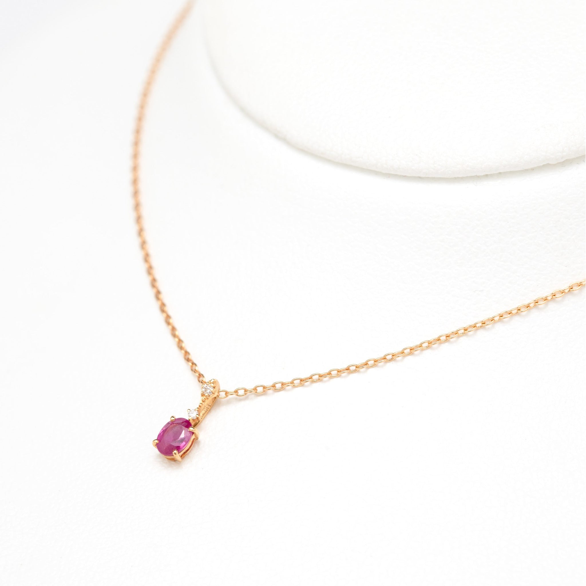 ルビーの艶やかなレッドがゴールドのあたたかな輝きと調和し、胸元に上質な存在感を添えます。