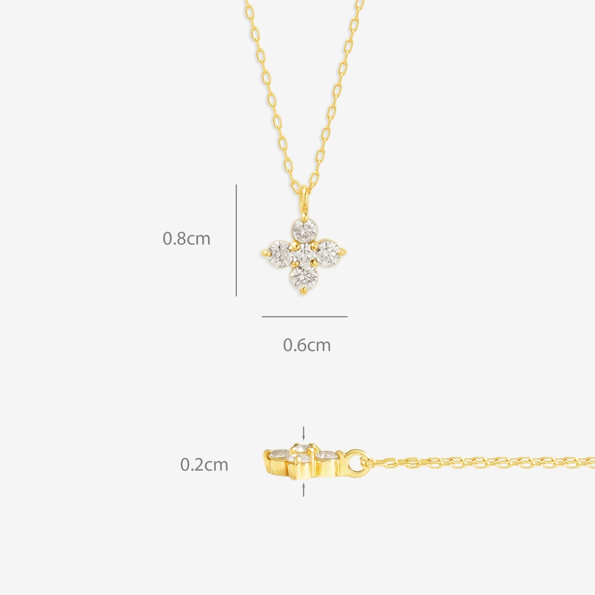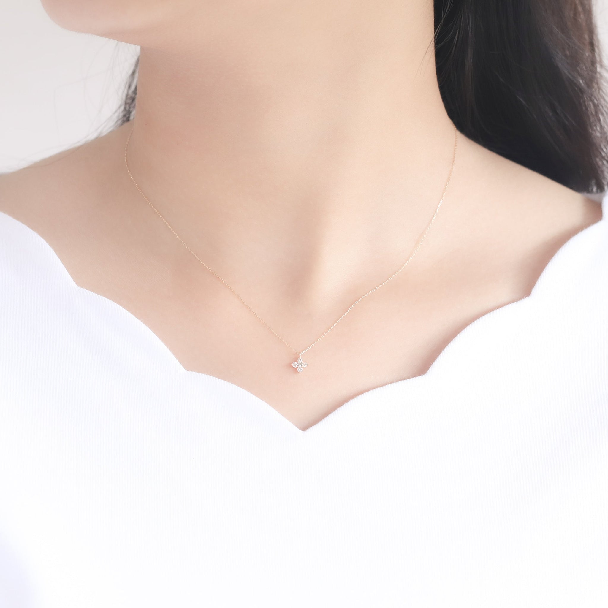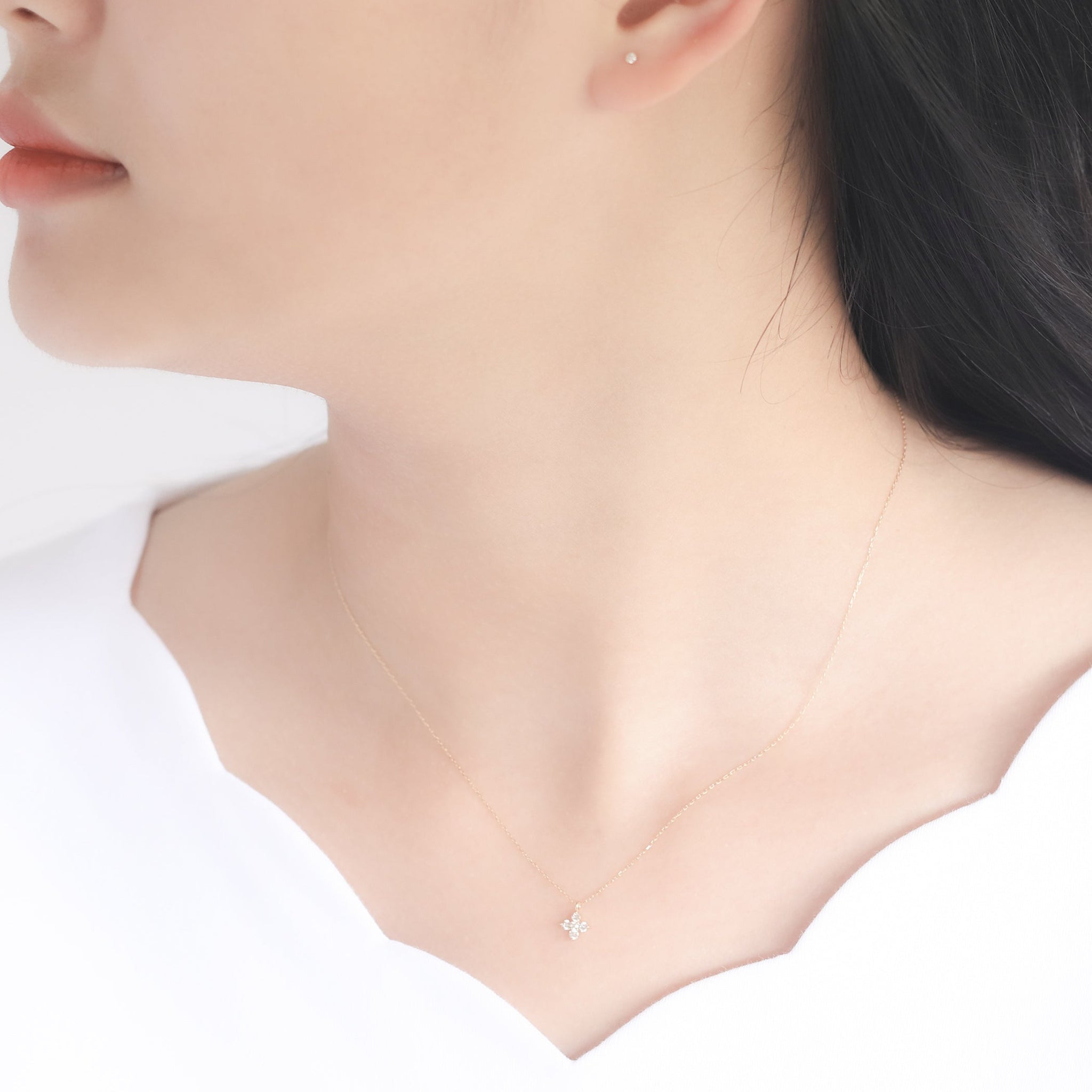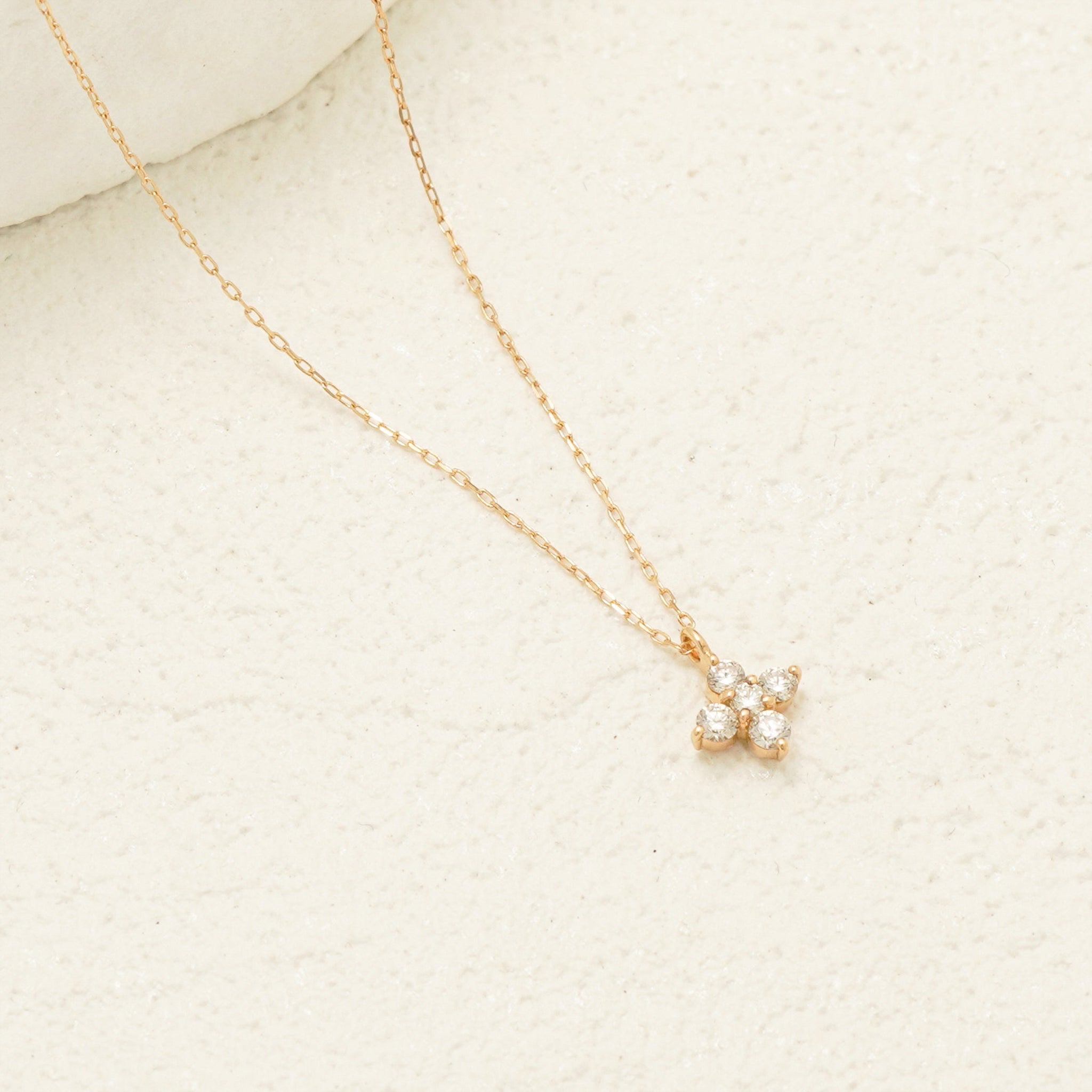 ダイヤモンドを花のように並べたデザインが、胸元に上品な輝きを添えます。