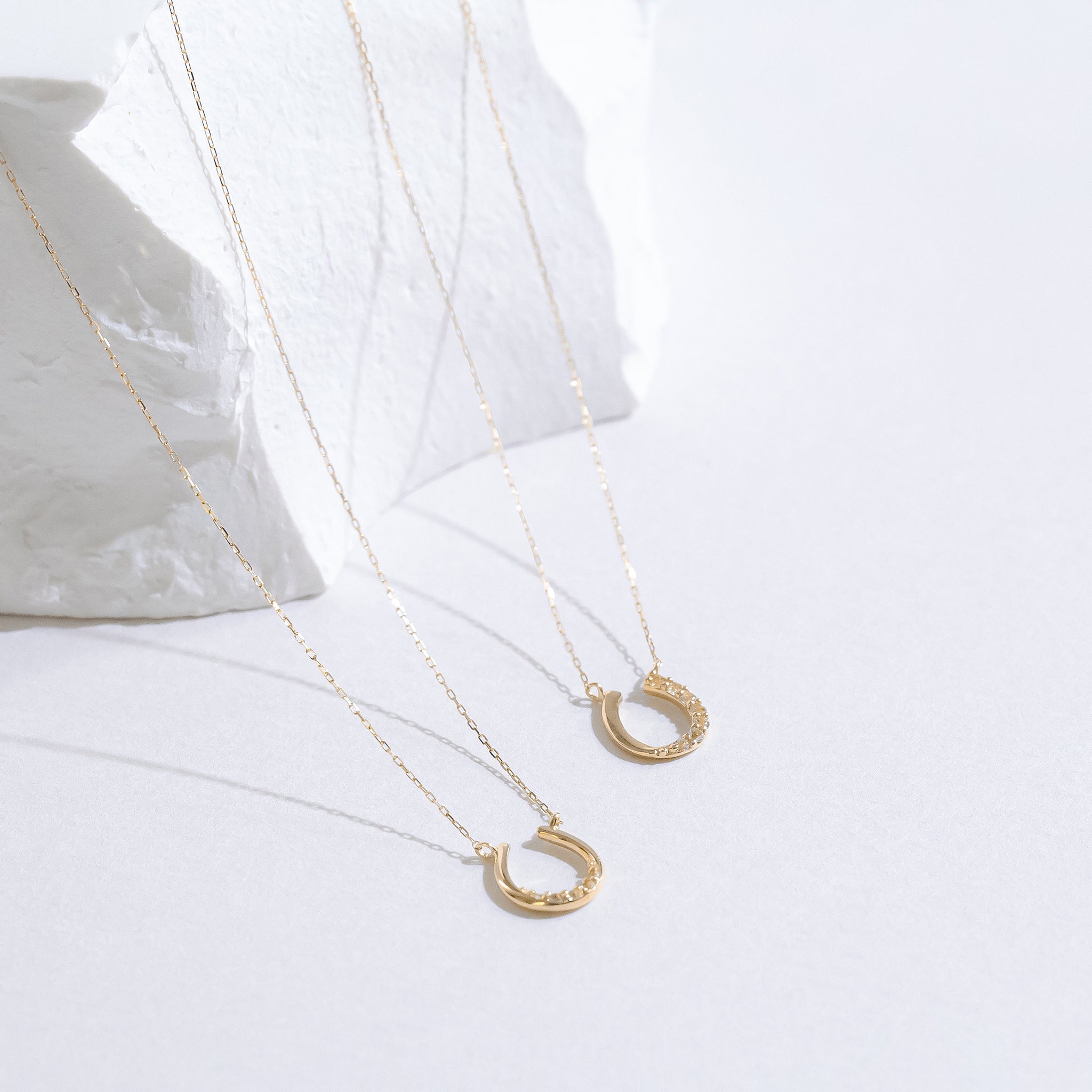 馬蹄モチーフでホワイトトパーズが輝くイエローゴールドのネックレス。