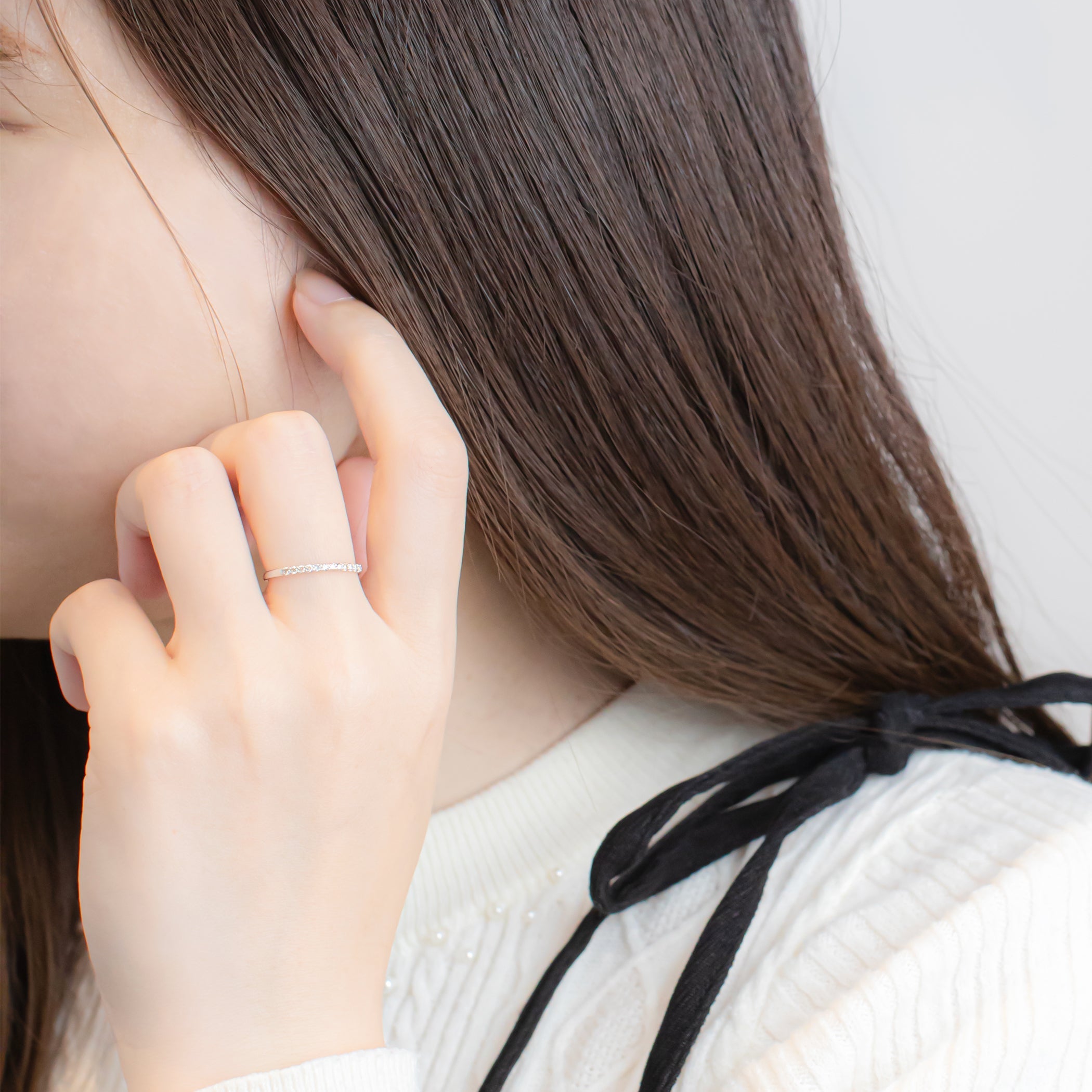 どんなスタイルにも合わせやすいデザインのダイヤモンドリングは、カジュアルからフォーマルまで幅広く活躍。