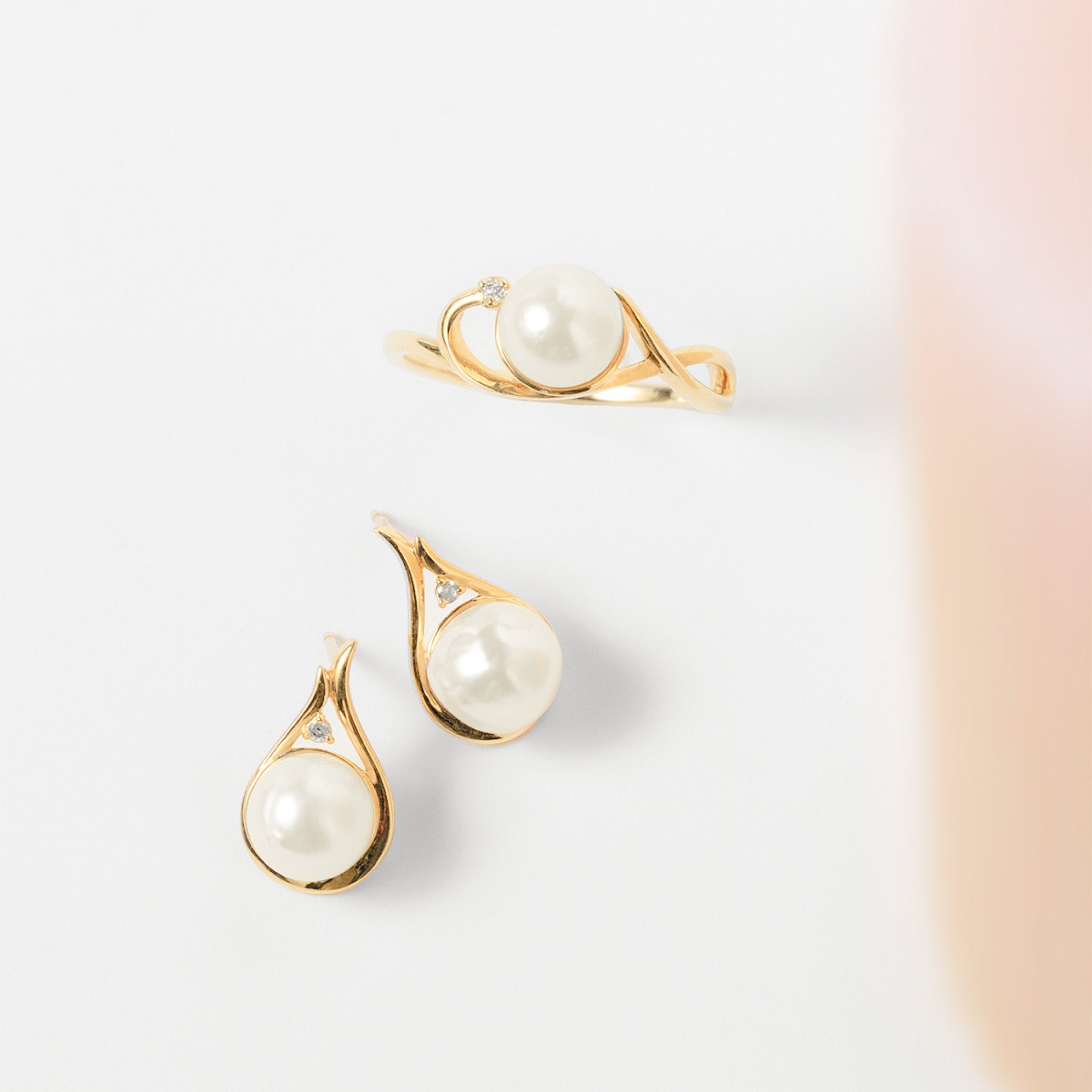 あこや真珠をイエローゴールドで包み込み、どこかクラシカルな雰囲気のリング。