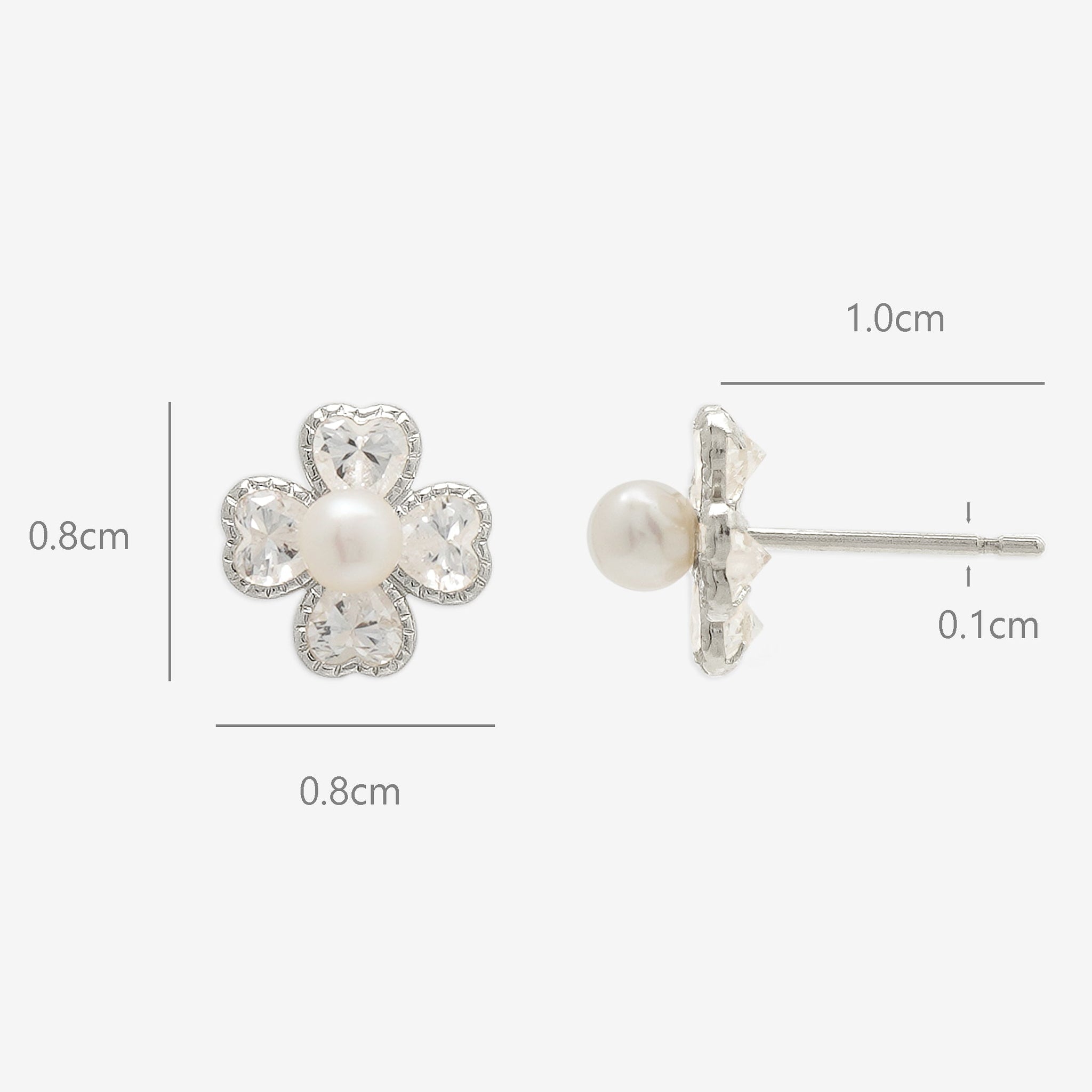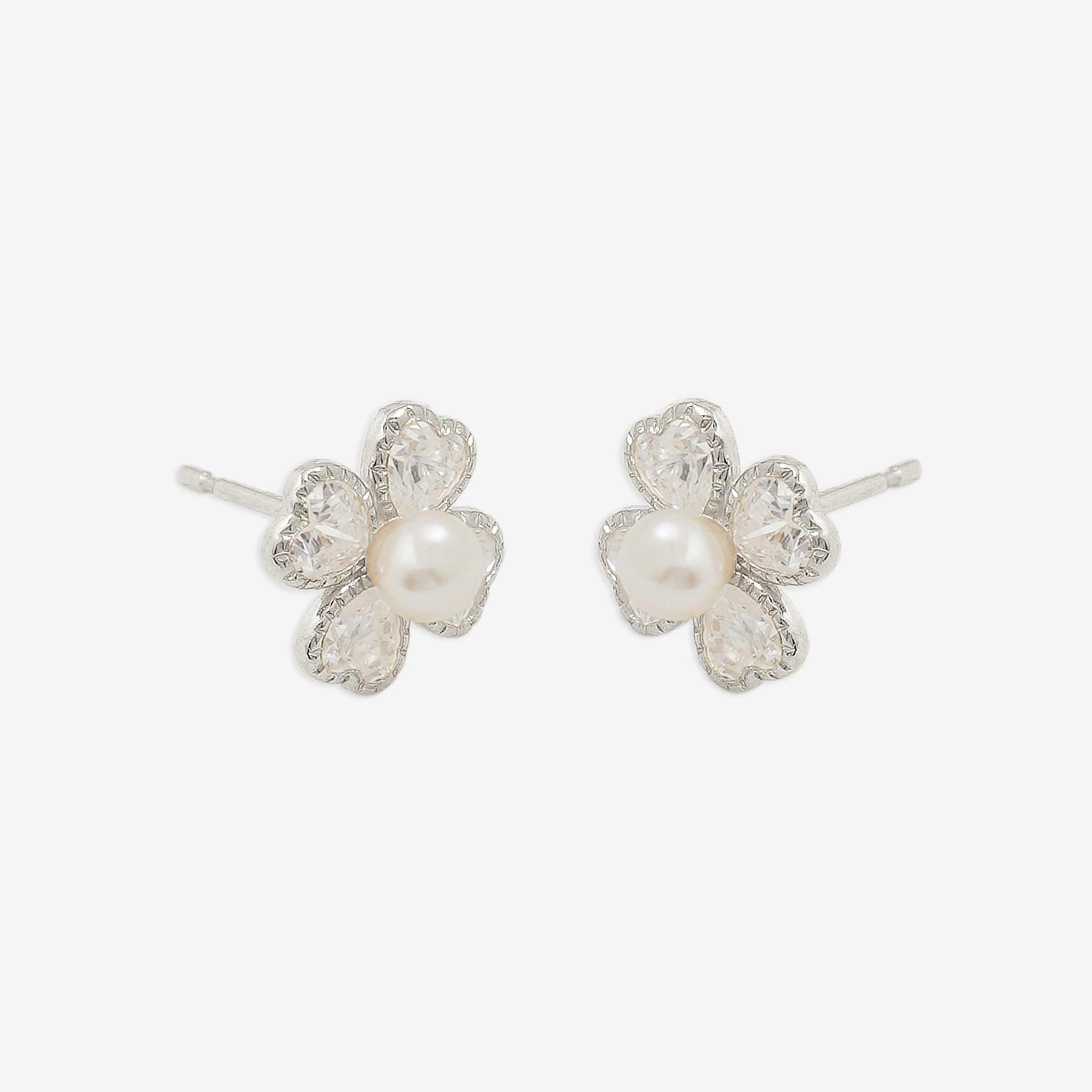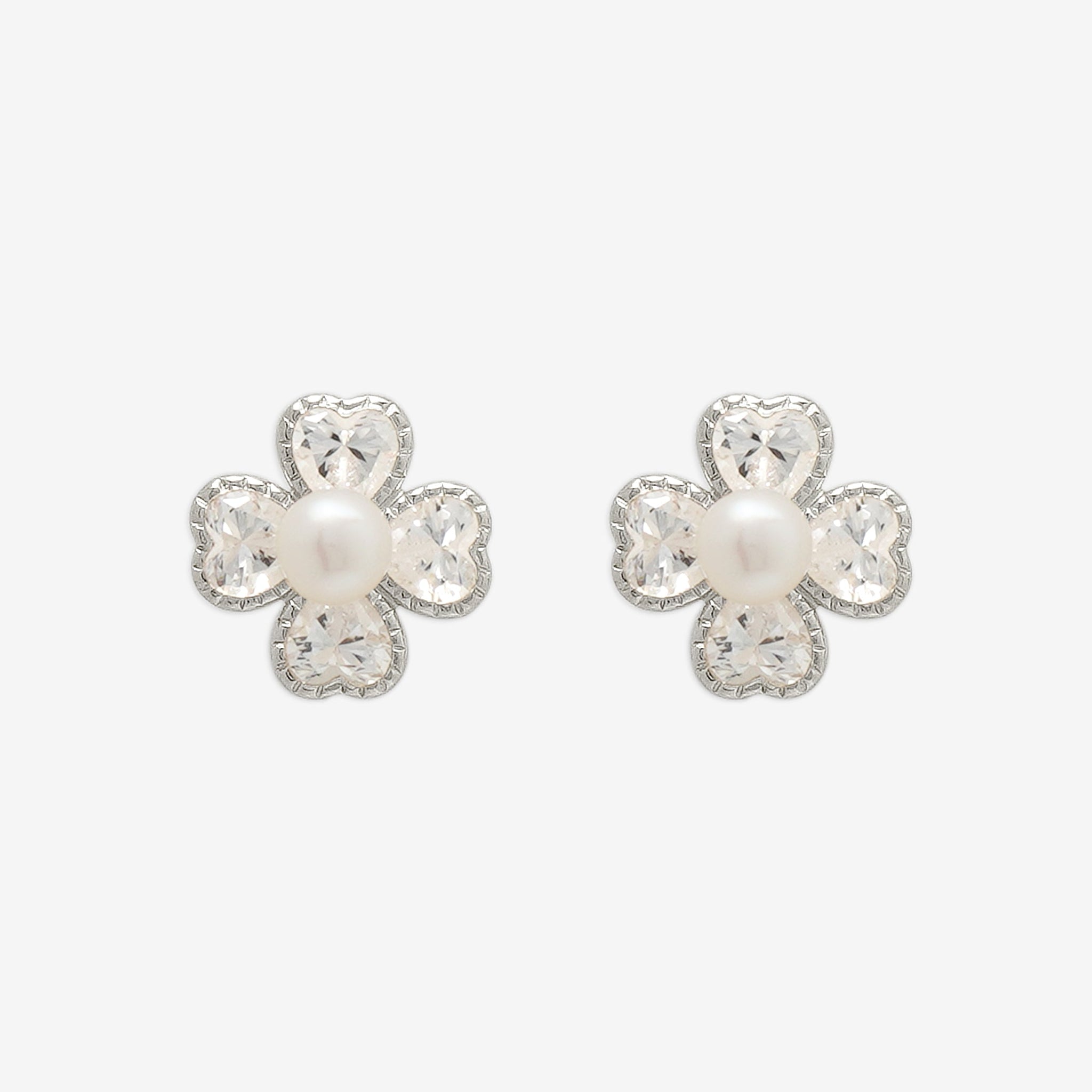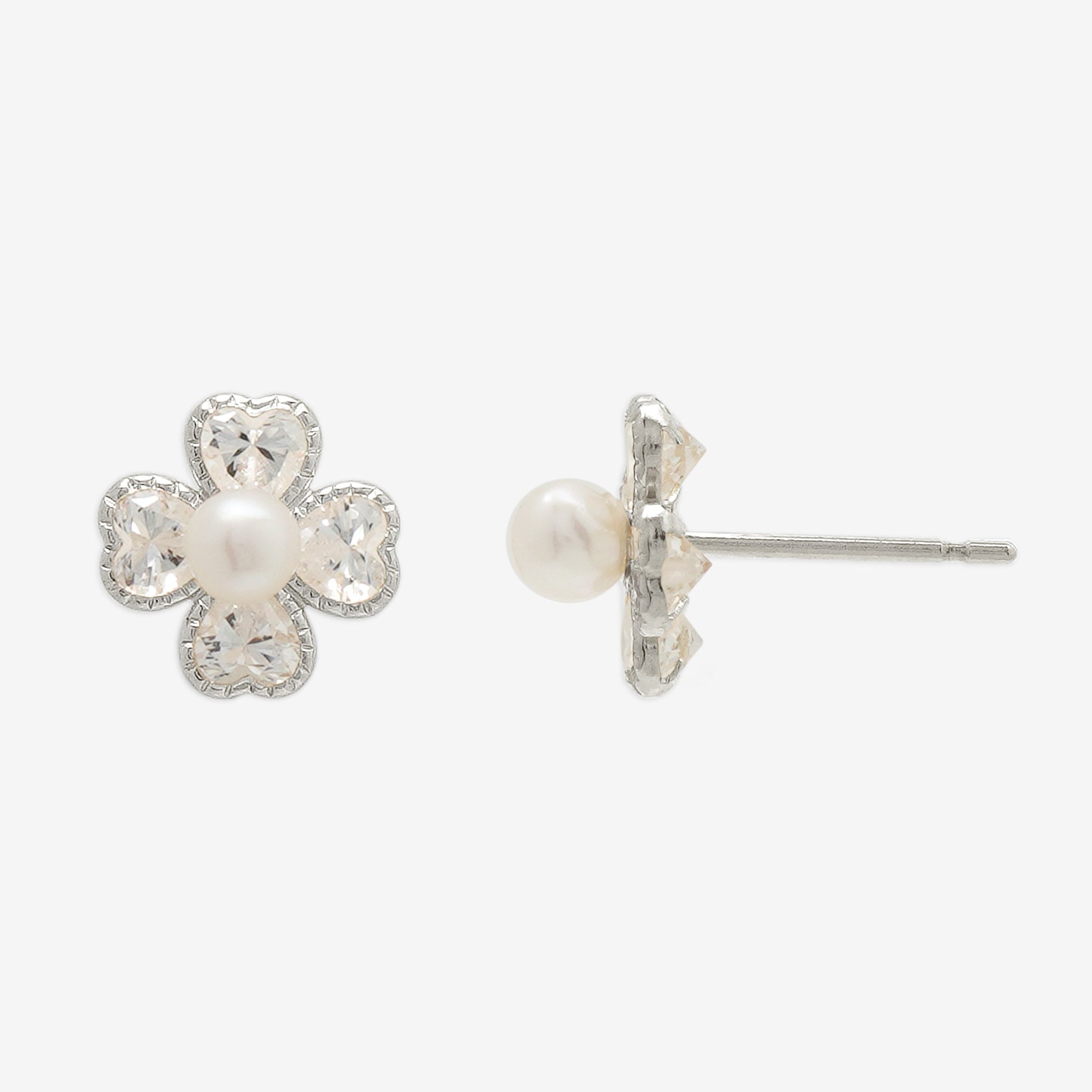 ハート型のキュービックジルコニアで構成されたクローバーが繊細な輝きを放ち、中央のパールが柔らかな光を添えます。